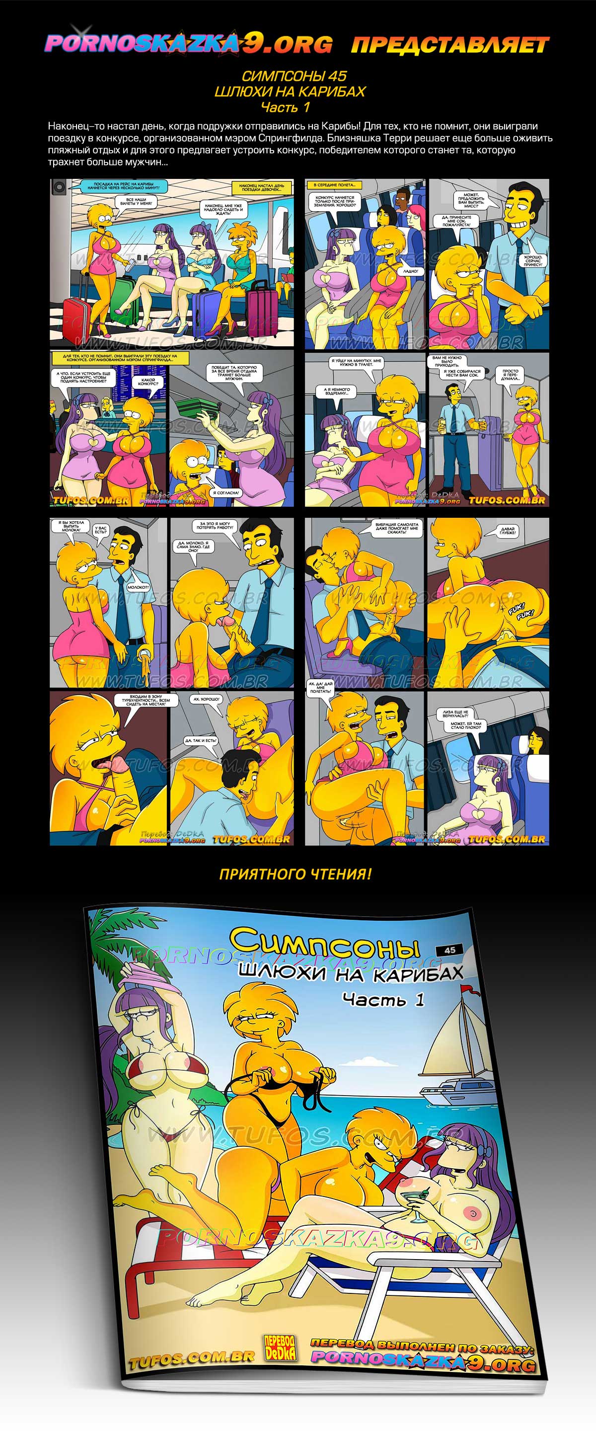 Порно комикс Симпсоны. Часть 45. Шлюхи на Карибах. Часть 1. Наконец-то настал день, когда подружки отправились на Карибы! Для тех, кто не помнит, они выиграли поездку в конкурсе, организованном мэром Спрингфилда. Близняшка Терри решает еще больше оживить пляжный отдых и для этого предлагает устроить конкурс, победителем которого станет та, которую трахнет больше мужчин…