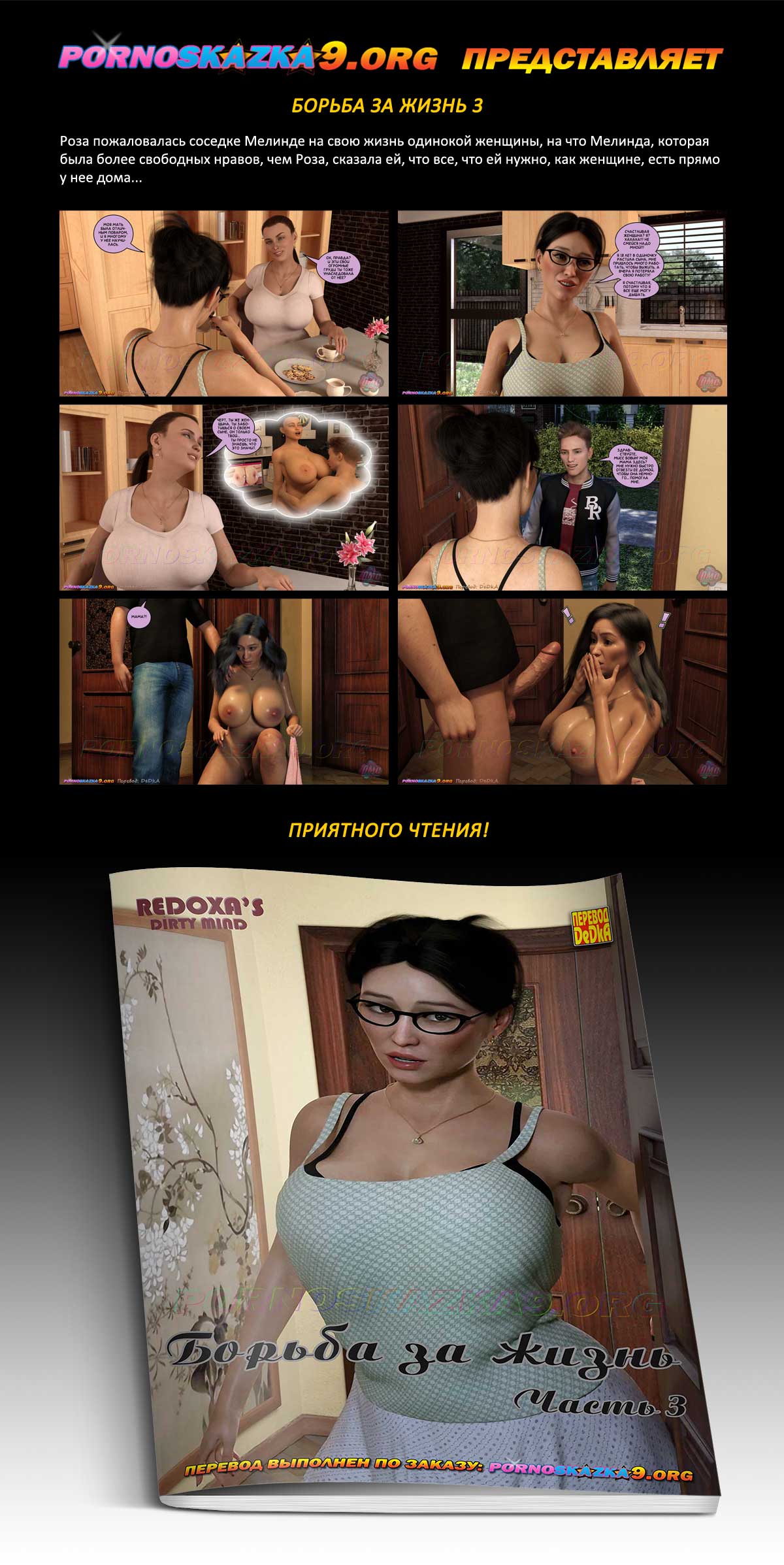 Порно комикс «Борьба за жизнь. Часть 3.» Роза пожаловалась соседке Мелинде на свою жизнь одинокой женщины, на что Мелинда, которая была более свободных нравов, чем Роза, сказала ей, что все, что ей нужно, как женщине, есть прямо у нее дома…